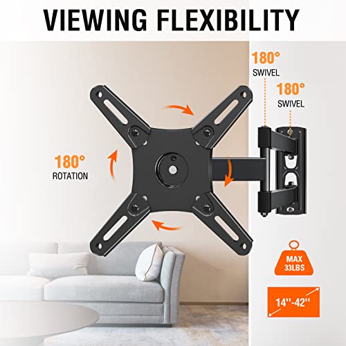 TV Wall Mount Applicability – This TV mount fits most 14-42 inch LED/LCD TVs and monitors, with 33 lbs. MAX loading and VESA sizes from 75x75mm to 200x200mm. This wall mount TV bracket is designed for single wood stud or concrete/brick walls and compatible with TCL, SAMSUNG, LG, VIZIO, SONY, HISENSE, SCEPTRE, and other TV brands.