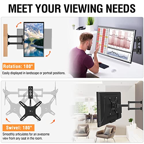 180º Rotation & Swivel Design – With the 180º rotation unique design, the full motion TV mount can easily display in landscape or portrait position to meet your special need. Also, this swivel TV mount can swivel TV 180º to cover any angles in your home for the ultimate viewing experience.