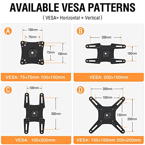 Universal Monitor Wall Mount – Our monitor mount fits monitors sizes 13, 17, 19, 20, 21 22, 24, 27, 32, 34, 35 inch with VESA patterns from 75x75mm to 200x200mm. This wall monitor mount can keep your monitor to eye level and mount your monitor at an ergonomic sitting position to reduce eyes train and neck pain while saving up much space on your desktop.